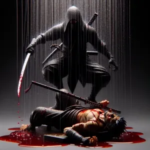 «The sinister ninja stands over their fallen enemy, blood drippin...»