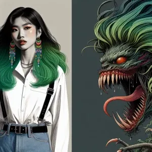 «Full-body evil girl with xenomorph pet monster in Scary forest»