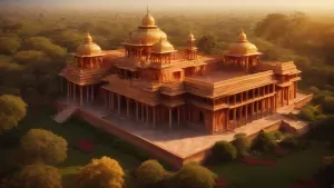 «stunning aerial view of a majestic royal palace nestled high in...»