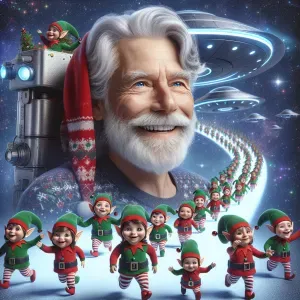 «Jolly North Pole scene.photorealistic . Grey haired man is surro...»