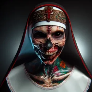«macabre conjuring closeup of a demonic nun with half skeletal fa...»