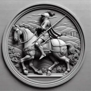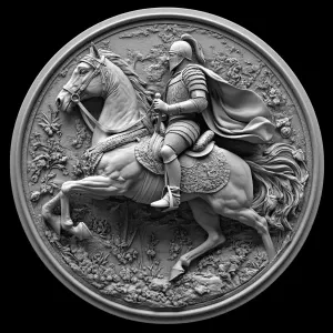 «Renaissance knight on a horse, grayscale 3d bas relief, round bo...»