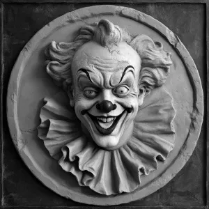 «Psychotic clown, grayscale 3d bas relief, round border»