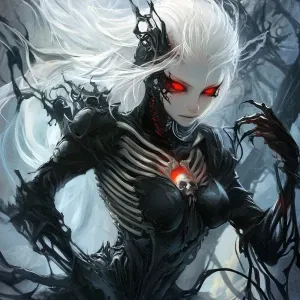 «witch, cyber, fantasy , anime, red eyes, and have bones in costu...»