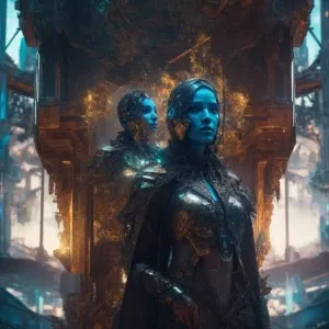 «A luminously intricate cosmic hacker depicted in a vibrant gouac...»