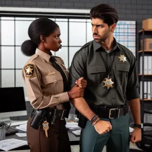«A deputy sheriff being escorted out of a scheduling office after...»