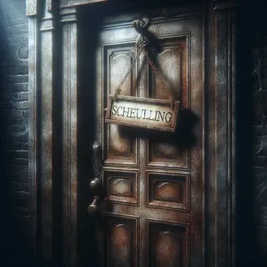 «A detailed image of an eerie, aged door featuring the word "Sche...»