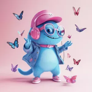 «ChillGuy, a playful and inventive blue monster character wearing...»