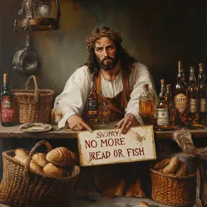 «Jesus of Nazareth sits with his shoulders shrugged at a table wi...»