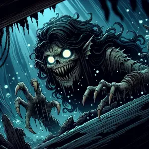 «An evil mermaid with sharp teeth, malevolent glowing eyes, and d...»