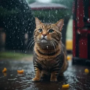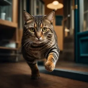 «A green eyed tabby cat with a serious expression is dressed like...»