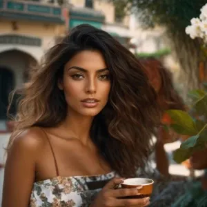 «Two tall, athletic female models sipping coffee in a cozy Cyprus...»