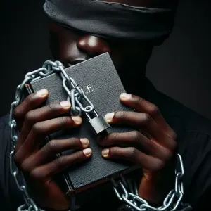 «Black man is blindfolded. with a bible in his hand. The Bible i...»