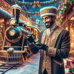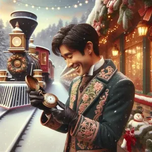«A joyful Victorian-era train conductor looking at an ornate pock...»