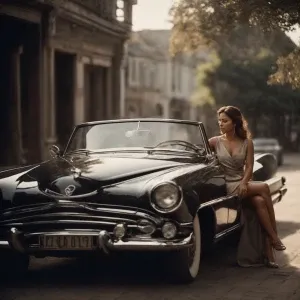 «“A black-and-white portrait of a boxum woman leaning on a classi...»
