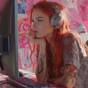 «Generate an image of a supermodel woman with red hair and blue e...»