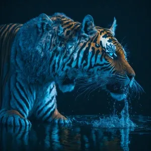 «Tiger with royal bule fur , neon blue eyes, getting a drink of w...»