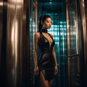 «Design an image featuring a Asian woman inside an elevator poise...»