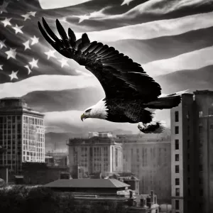 «Create an image of an eagle soaring with the American flag on on...»