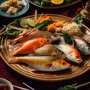 «Steamed Chinese fish served on a traditional plate with chopstic...»