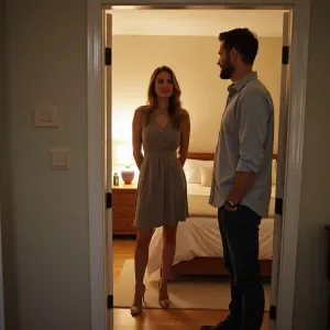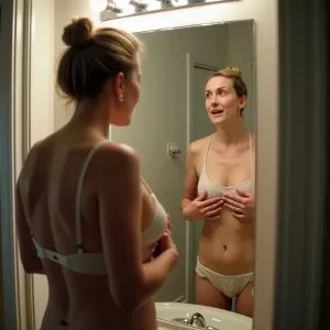 «A 40-year-old suburban housewife is standing in her bedroom, get...»