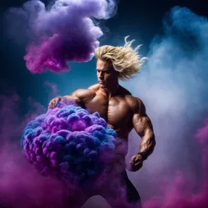 «Create an image of a blond, muscular male genie with a bodybuild...»