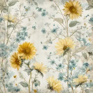 «flat 2D surface design, vintage sunflower and blue wildflower pa...»