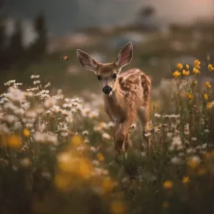 «Baby fawn gently walking through tall wildflowers in Rocky Mount...»