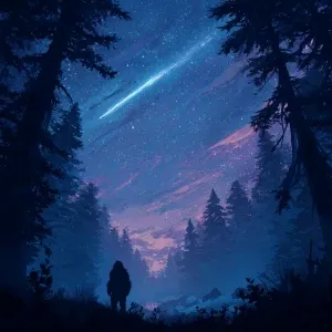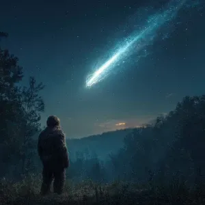 «Show a large meteor in the sky over wooded area in Ohio. Show a...»