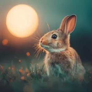 «“ultra-realistic baby rabbit sitting in soft meadow grass, warm...»