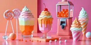 «A pastel orange and bright pink scene. On a pastel peach pink ta...»