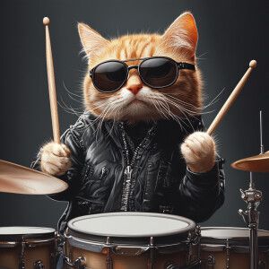 «A cat wearing sunglasses and a black jacket is playing a drum ki...»