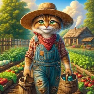 «a rustic farmer cat, with a worn straw hat and a bushy whisker,...»