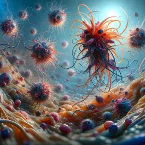 «"Under the microscope, a microscopic battlefield unfolds, teemin...»