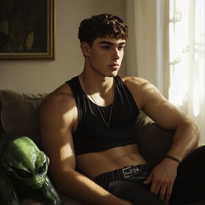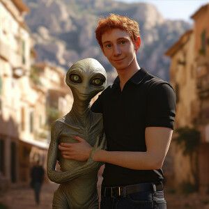 «Capture a hyper-realistic image of a man and an alien in an aff...»