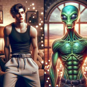 «Capture a hyper-realistic image of a man and an alien man in an...»