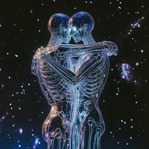 «2 men, hugging in the vast cosmos, surrounded by the infinite ex...»
