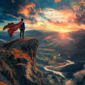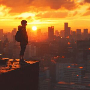 «A teenager standing on the edge of a rooftop at sunset, gazing a...»
