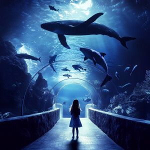 «Aquarium, whales swimming overhead, a little girl admiring, scho...»