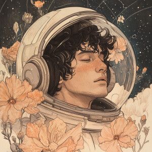 «ink style , colored , sketch , A young man inside a space helmet...»