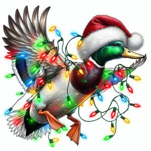 «A detailed illustration of a Mallard duck in mid-flight, wrapped...»
