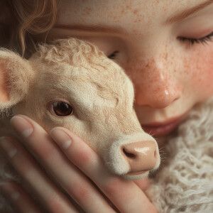 «A tender scene featuring a small, adorable cow, no larger than a...»