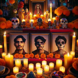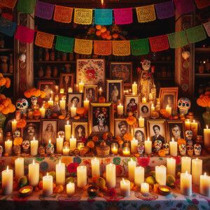 «Dias de los muertos alter with 3 framed pictures and candles»
