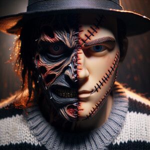 «vivid intricate details of a 3D face one side is freddy Kruger a...»
