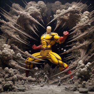«Saitama, clad in his iconic yellow bodysuit and red gloves, unle...»