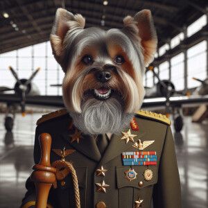 «Antropomorphic old yorkie clad in Army outfit and general stars,...»