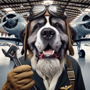 «Antropomorphic old St Bernard clad in pilot outfit and goggles,...»
