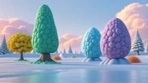 «Create a 3D minimalist Stone Age forest clearing, part of a cohe...»