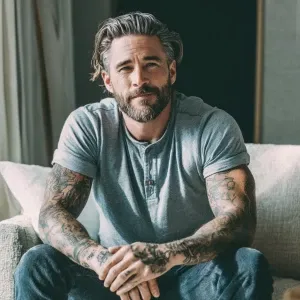 «Hey, check out this dude with a beard and tattoos. He's sitting...»