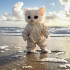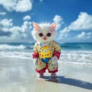 «white kitten wearing a spongebob clown suit standing like a huma...»